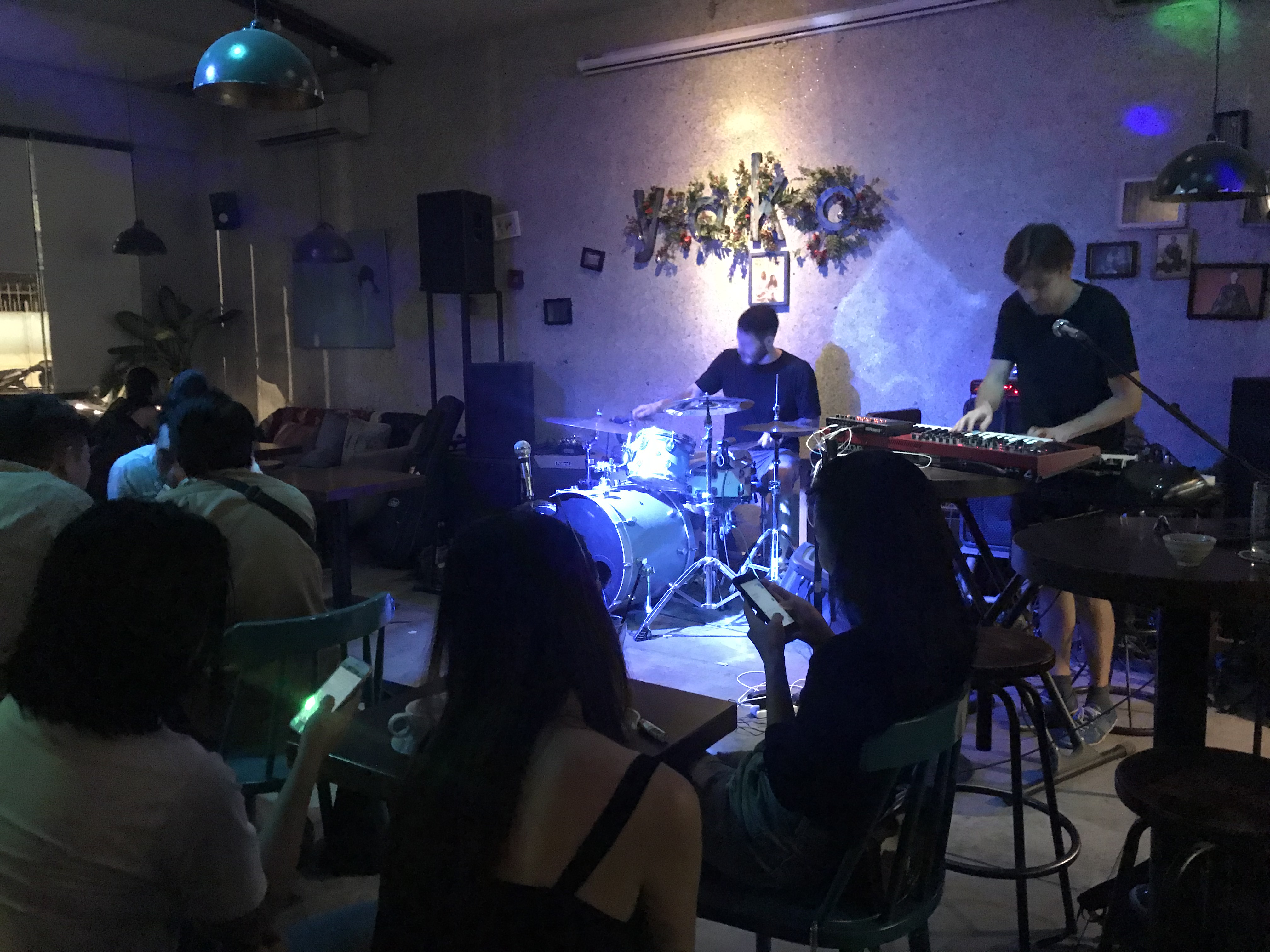 Yoko Cafe on viihtyisä baari, jonka pienellä lavalla aloitti Saigoniin asettunut nottinghamilainen laulaja Lucy Alexandra Howson. Häntä säesti paikallinen kitaristi Nguyen Hieu Liem. Yoko Cafe oli vetänyt iltaysiltä alkaneelle keikalle mukavasti väkeä. Osa oli kaltaisiani muualta tulleita, joista taas suurin osa varmaan pitemmällä visiitillä kuin meikäläinen. Lucy & Liem The LSD duo esitti omaa tuotantoa ja illan lyhyeen settiin mahtui nippu uunituoreita kappaleita, joiden sanoja Lucy välillä lauloi pienestä muistikirjasta ja välillä puhelimen näytöltä. Kitaristi Liem säesti velhon ottein. Lucyn laulut ovat intiimejä bluespohjaisia ja paikoin nimensäkin mukaan psykedeelisiä sävyjä omaavia biisejä, joissa eri mielentasoissa hempeys pehmentää sopivasti raakuutta ja taas ajoittain rujous karhentaa suloisuutta.