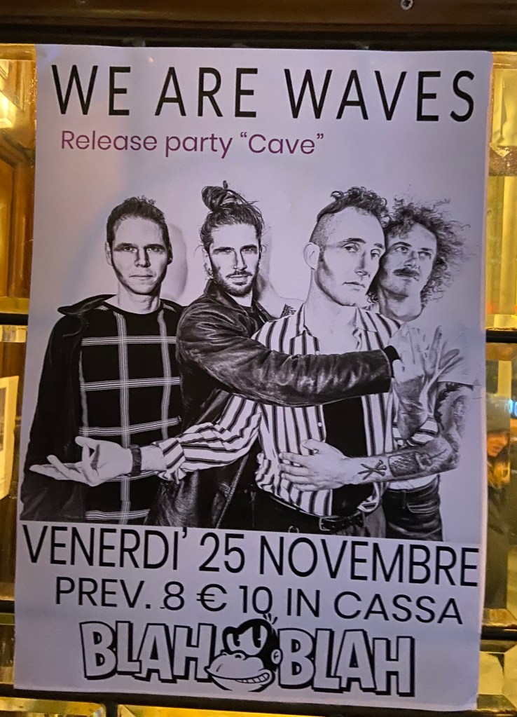 Uunituoretta Cave -albumia juhlistettiin kulttuuriluolassa nimeltä Blah Blah, joka sijaitsee kaupungin keskeisellä Via Po -kadulla. Ulospäin pienehköltä baarilta vaikuttanut tila osoittautui mainioksi paikaksi, missä kapakan toinen puoli oli miniatyyrikonserttisali, mikä toimii ajoittain myös elokuvateatterina. Pikkuriikkiselle klubille ei montaa kymmentä henkeä mahtunut, mutta tarjosi vaikutelman isommasta klubista.